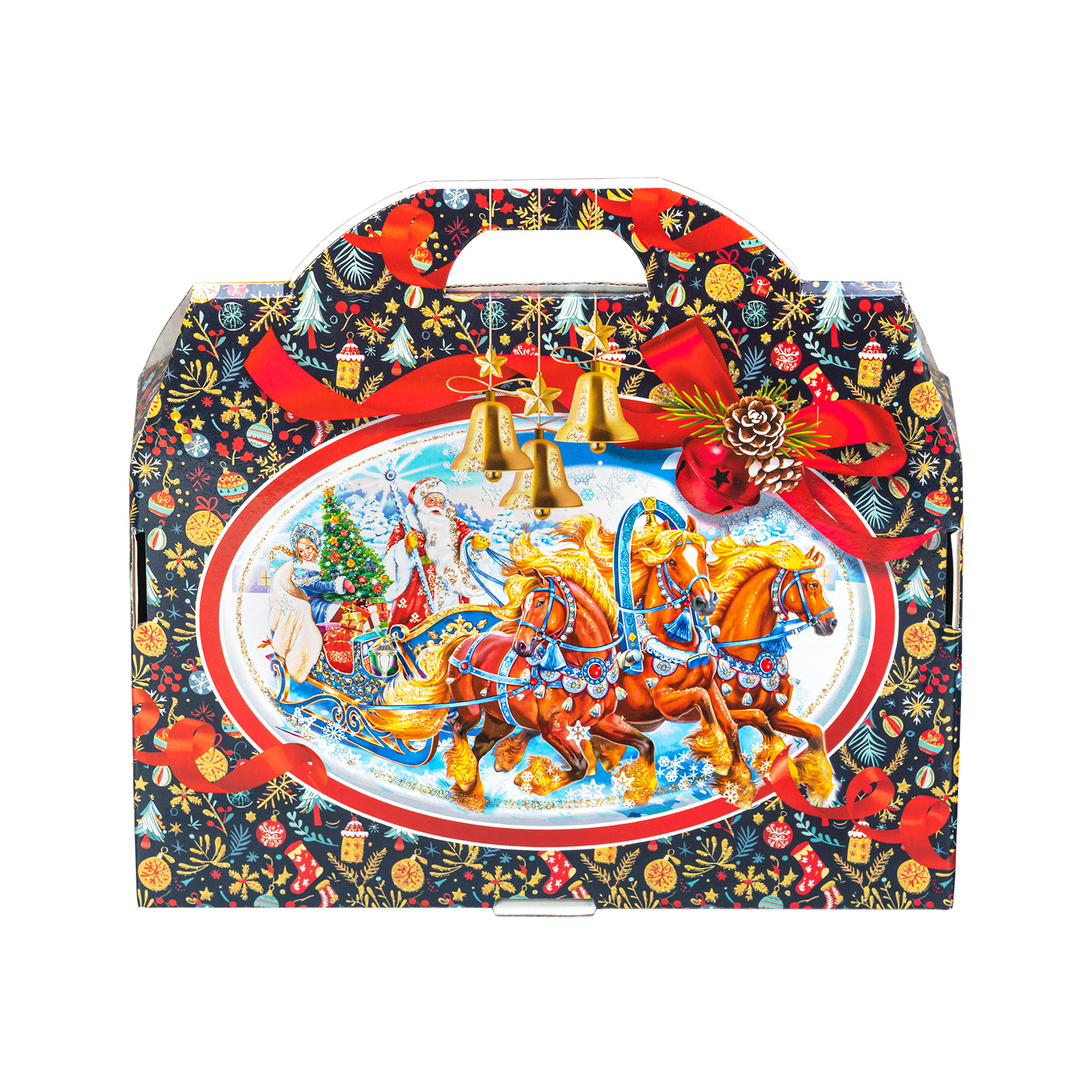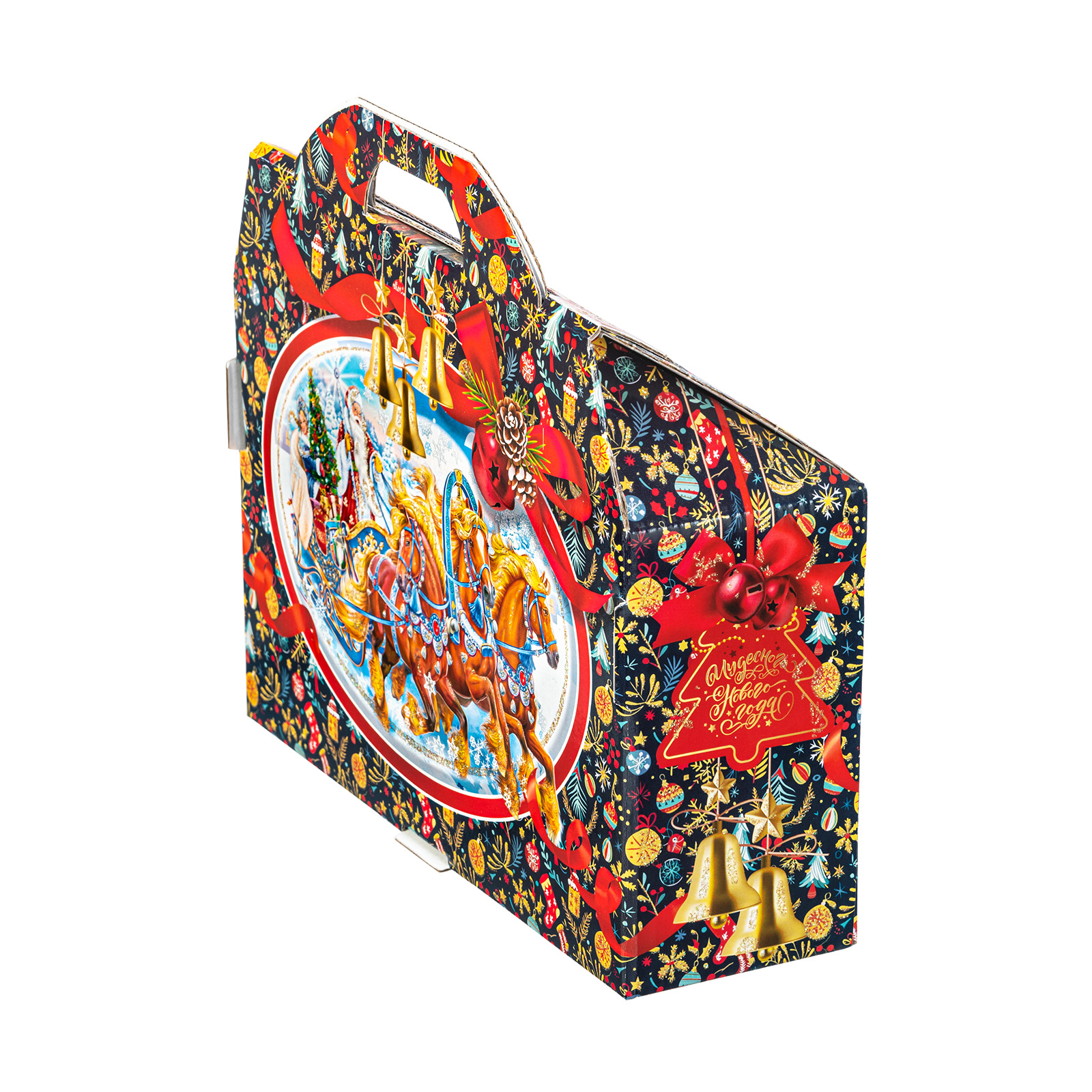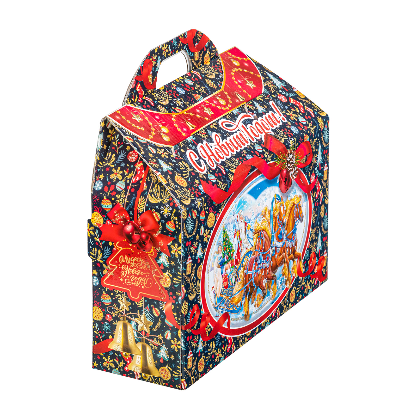 Представляем вам Новогодний Сладкий Подарок в форме стильного чемоданчика! Этот уникальный набор подходит как для подарков близким, так и для корпоративов, создавая атмосферу волшебства и тепла в эти зимние дни!Яркая упаковка сразу привлечет внимание своим оформлением: темно синий фон здесь идеально сочетается с контрастными элементами. Наличие удобной прорезной ручки делает подарок очень удобным для транспортировки.  Внутри набора находятся разнообразные вкусные сладости, которые станут украшением любого праздничного стола. Помимо сладкого наполнения, набор может порадовать небольшим памятным сувениром в виде символа наступающего года.