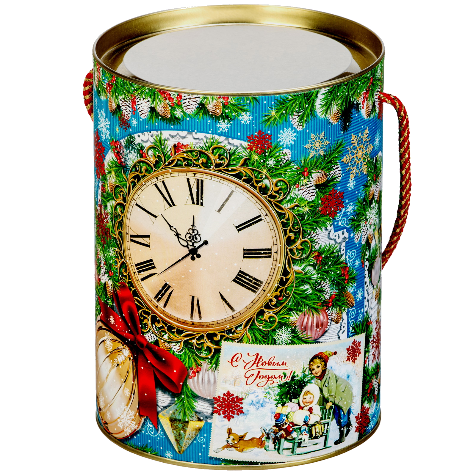 Базовый новогодний сладкий подарок, который придется по душе сластене абсолютно любого возраста. Подарочная упаковка, сделанная из плотного картона, выполнена в виде тубы, украшенной яркими новогодними рисунками: открытками, елочными шариками, снежинками. Упаковка имеет плотную металлическую крышку, а также удобную ручку-веревку ярко-красного цвета. Внутри этой тубы бережно хранятся самые разнообразные вкусные сладости, которые станут идеальным дополнением на любом семейном чаепитии в эти новогодние праздники!